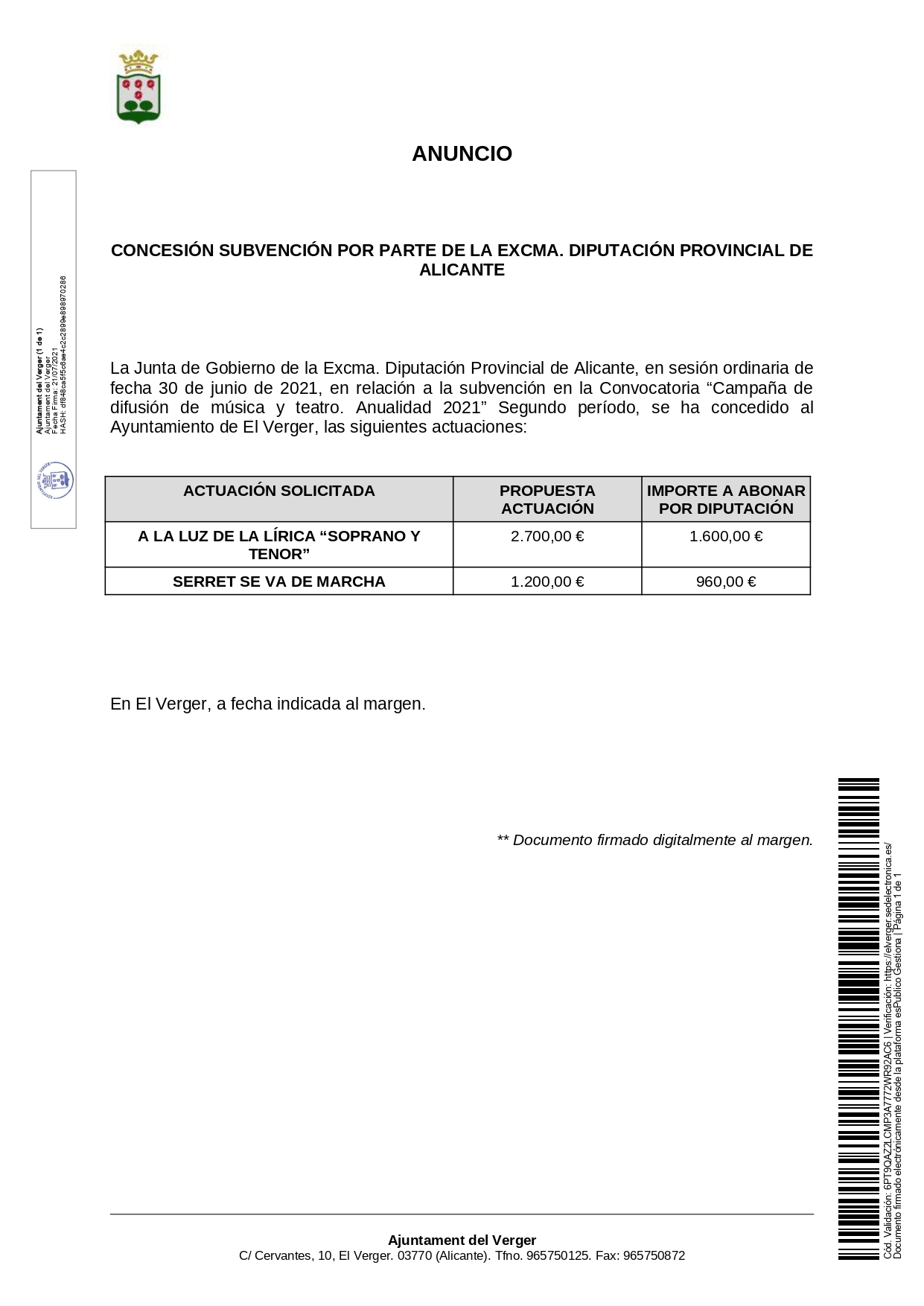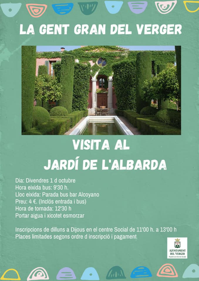 El divendres dia 01 d’Octubre hi ha una eixida programada per la Gent Gran del Verger per a visitar els Jardins de l’Albarda a Pedreguer. L’exida serà a les 9:30 hores des de la parada d’autobús del bar Alcoyano. Per a la inscripció hi ha que passar per l’oficina del Centre Social fins el dijous …