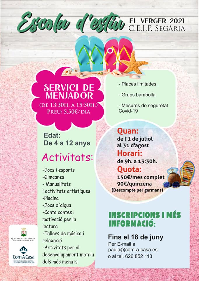 La Regidoria d’Educació de l’Ajuntament del Verger convoca l’Escola d’Estiu anualitat 2021. Aquest és un projecte d’educació en el temps lliure amb què es pretén que la gent menuda del nostre municipi puga realitzar activitats lúdiques i educatives en les seues vacances estiuenques. L’edició de 2021 continua marcada per la situació provocada pel COVID 19; …