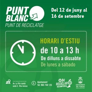 La Regidoria de Medi Ambient de l’Ajuntament del Verger informa que l’horari del Punt Blanc durant els mesos de l’estiu serà el següent:
