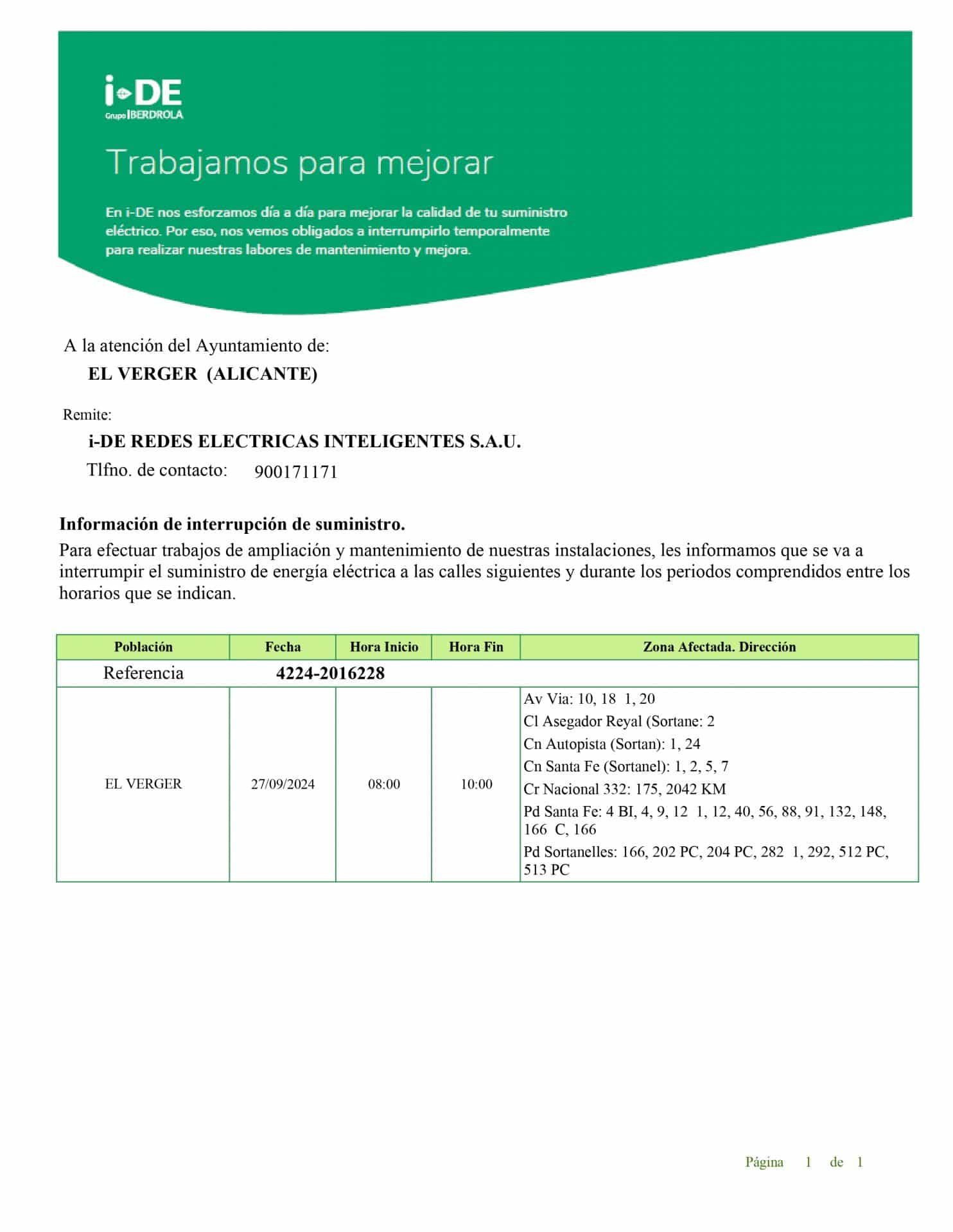 Des de l’Ajuntament del Verger es comunica del pròxim tall de subministre elèctric, que tindrà lloc el pròxim 27 de setembre des de les 08:00 hores fins les 10:00 hores per a poder realitzar treballs d’ampliació i manteniment de les instal·lacions.
