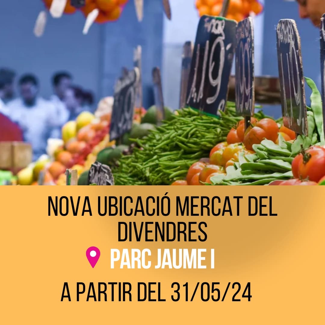 A partir de hui 31 de maig, el Parc Jaume I serà la nova ubicació del mercat dels divendres.Des de la Regidoria de Comerç s’espera que esta mesura servisca per a revifar les compres i l’afluència de gent.
