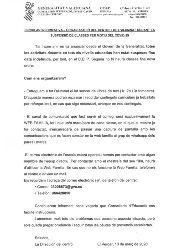 Es suspèn tot tipus de classe d’activitat docent en el nostre poble, fent referència al comunicat oficial de la Generalitat Valenciana. Per tant, en l’Escoleta i el CEIP Segària no hi haurà classe a partir del proper dilluns 16 de març fins nova ordre. D’aquesta manera, les Escoles de Música i els Cursos que es …