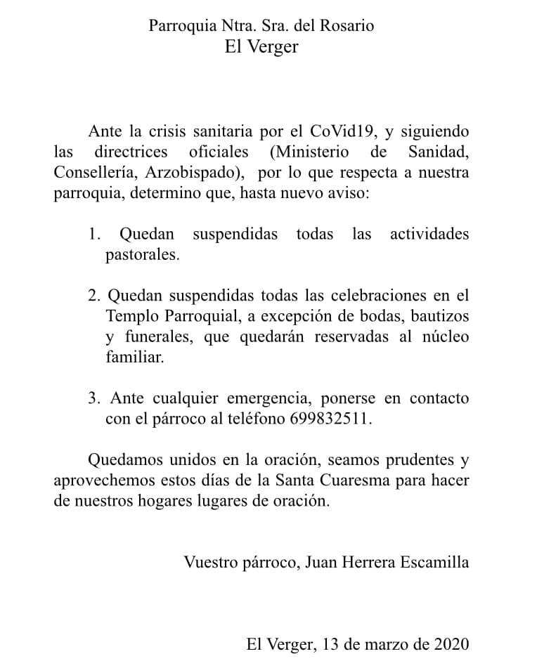 El Centre de Salut de El Verger ens informa: S’ha d’intentar no utilitzar els serveis sanitaris llevat que siga molt necessari, és a dir, no s’ha d’anar al centre de salut a no ser d’una urgència Vital. NO eixiu de casa, que és la principal recomanació. Les persones majors no han d’eixir de casa. Es …
