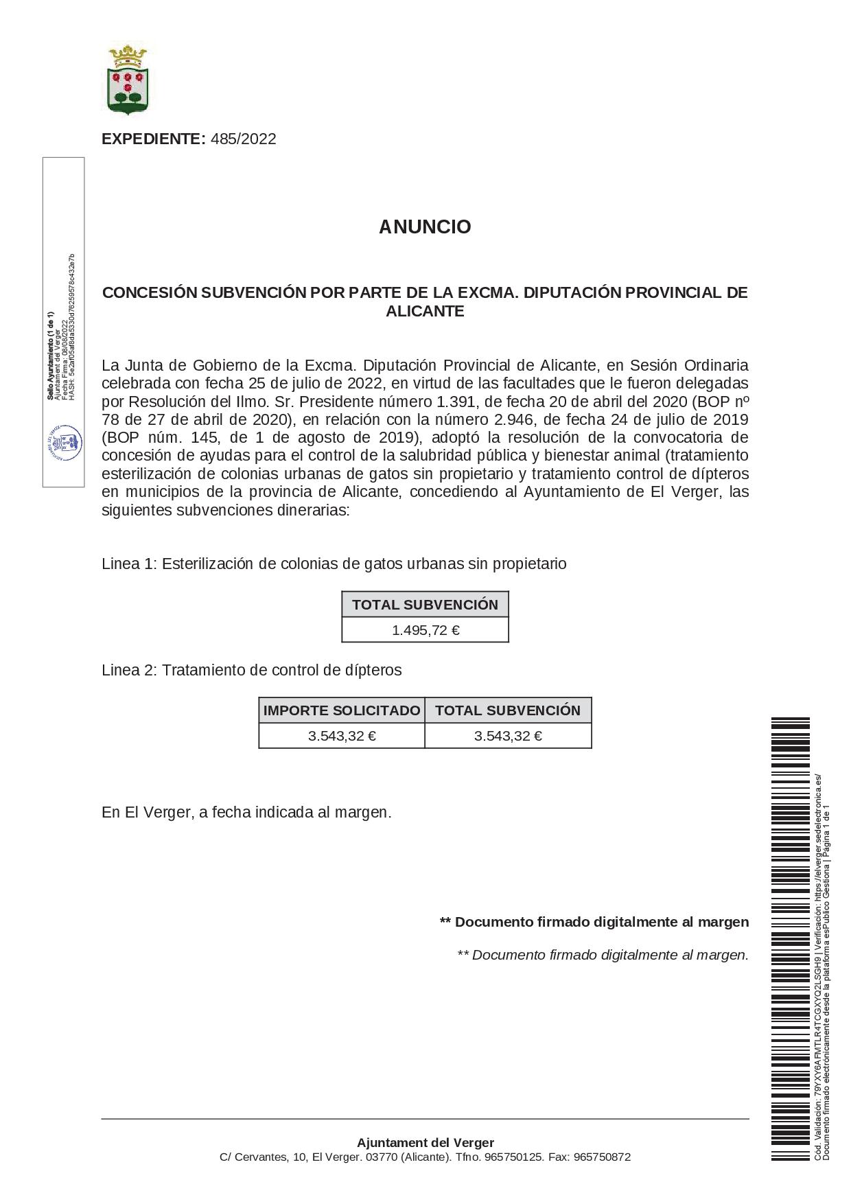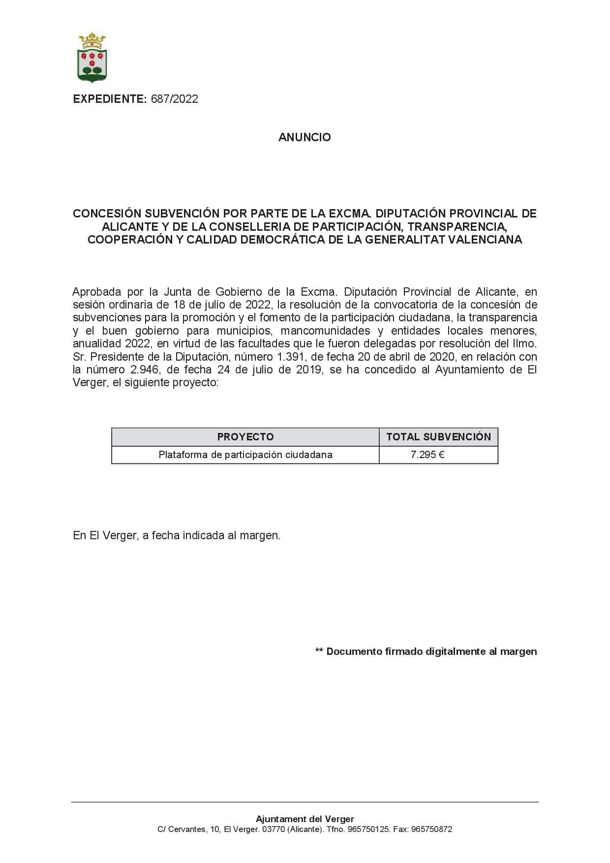 L’Excma. Diputació D’Alacant, concedeix a l’Ajuntament del Verger les següents subvencions: