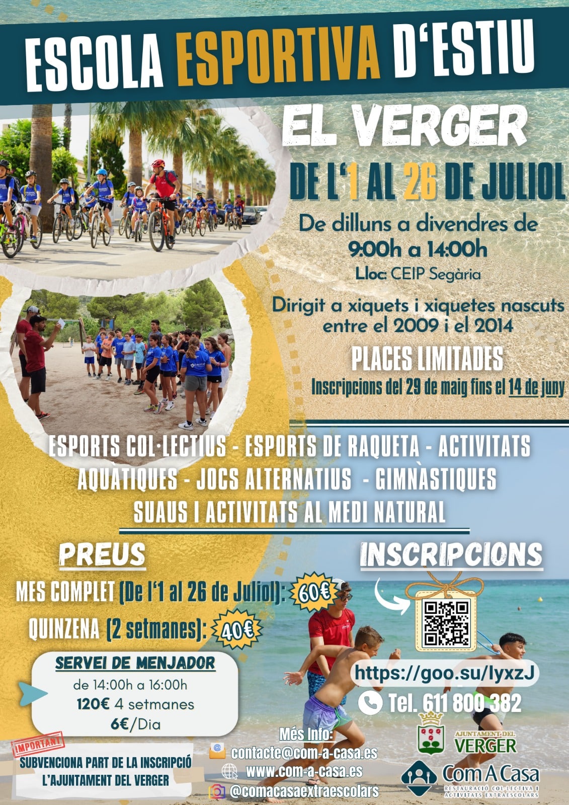 La Regidoria d’Educació de l’Ajuntament del Verger convoca l’Escola d’Estiu i l’Escola Esportiva d’Estiu anualitat 2024, oferint un any més el servei d’escola d’estiu per a xiquets i xiquetes de 6 a 15 anys durant el mes de juliol en l’escola esportiva d’estiu i durant els mesos de juliol i agost en l’escola d’estiu.