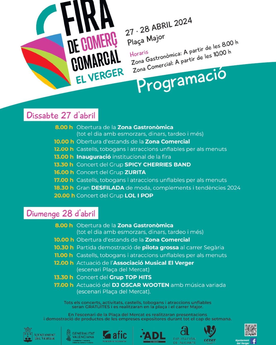 Els ciutadans podran disfrutar dels comerços tant locals com de la Marina Alta, així com asistir a concerts de diferents estils musicals, zona gastronòmica, castells, tobogans i atraccions unflables per als més menuts, i acudir a l’actuació de l’Associació Musical El Verger.