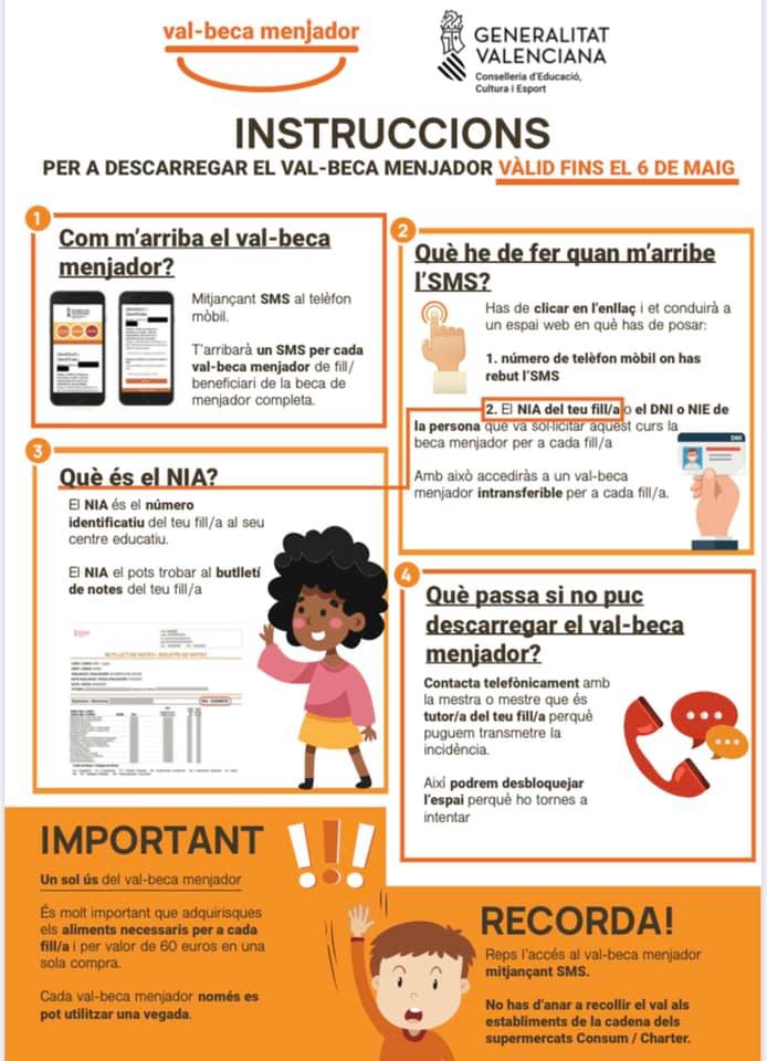 La Conselleria d’Educació, Cultura i Esport farà l’enviament, per SMS, del ‘val-beca menjador’ als telèfons mòbils de les famílies de vora 60.000 alumnes amb beca completa de menjador escolar. D’aquesta manera, es rebrà un enllaç que condueix a un espai en què cal posar el DNI o NIE del pare, la mare o tutor o tutora legal del menor que va sol·licitar aquest curs escolar la beca menjador de cada fill o filla. En aquest espai també es demanarà que es pose el número de telèfon mòbil on s’ha rebut el SMS.
