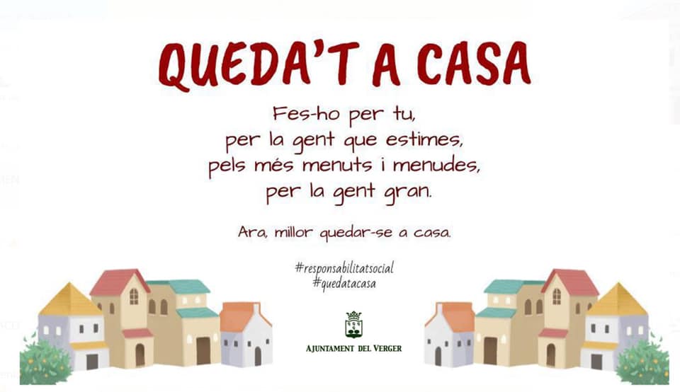 L’Ajuntament del Verger s’adhereix a la iniciativa “Queda’t A Casa” com a iniciativa preventiva per a evitar contagis del Covid-19.