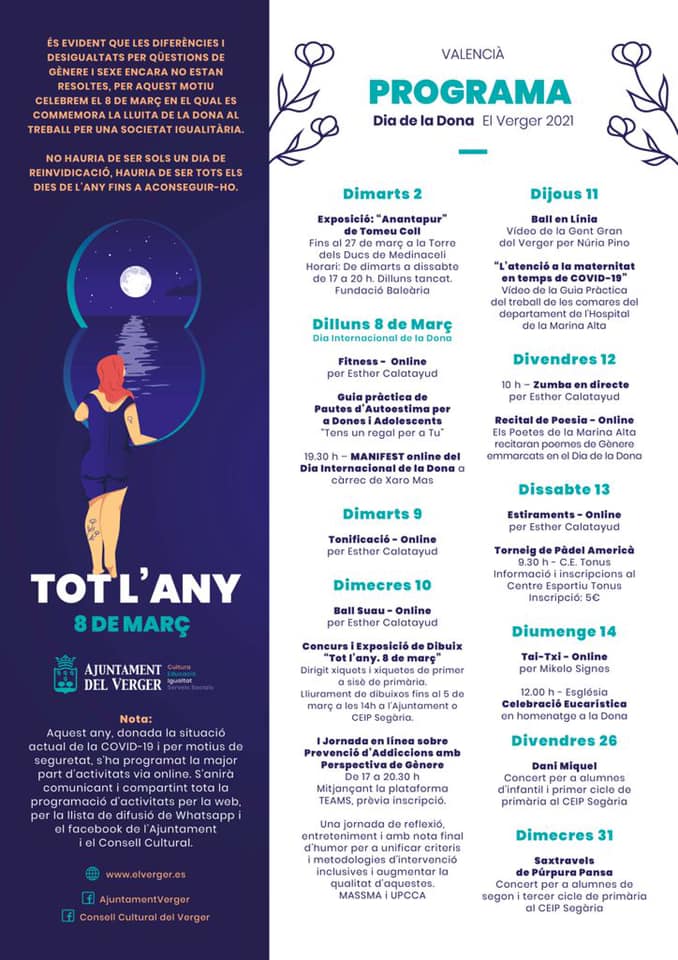 L’Ajuntament del Verger informa que les tres regidories: Igualtat i de la Dona, Educació i Cultura han treballat conjuntament per a preparar aquesta programació per al mes de març, emmarcat en el Dia Internacional de la Dona Treballadora (8M) .