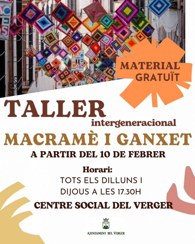 Des de l’Ajuntament del Verger es comunica que es posa en marxa un nou taller de macramè i ganxet. Aquest es realitzarà a partir del dia 10 de febrer i serà tots els dilluns i dijous a les 17:30 hores en el Centre Social. Este taller és intergeneracional, així que no importa l’edat. Animeu-se!!!!!