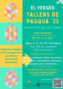 La Regidoria d’Educació de l’Ajuntament del Verger, gestionada per Imma Pericàs, anuncia el cartell informatiu dels Tallers de Pasqua 2023 que tindrà lloc en el CEIP Segària entre el 6 i el 14 d’abril.